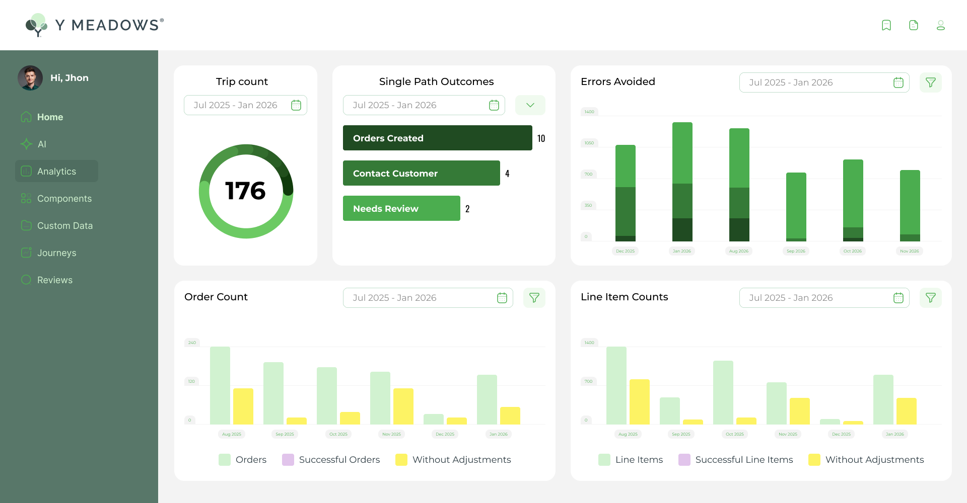 Y Meadows also automates customer operations workflows-order status, delivery questions, returns, pricing inquiries-with the same AI. One platform for order-to-support automation.