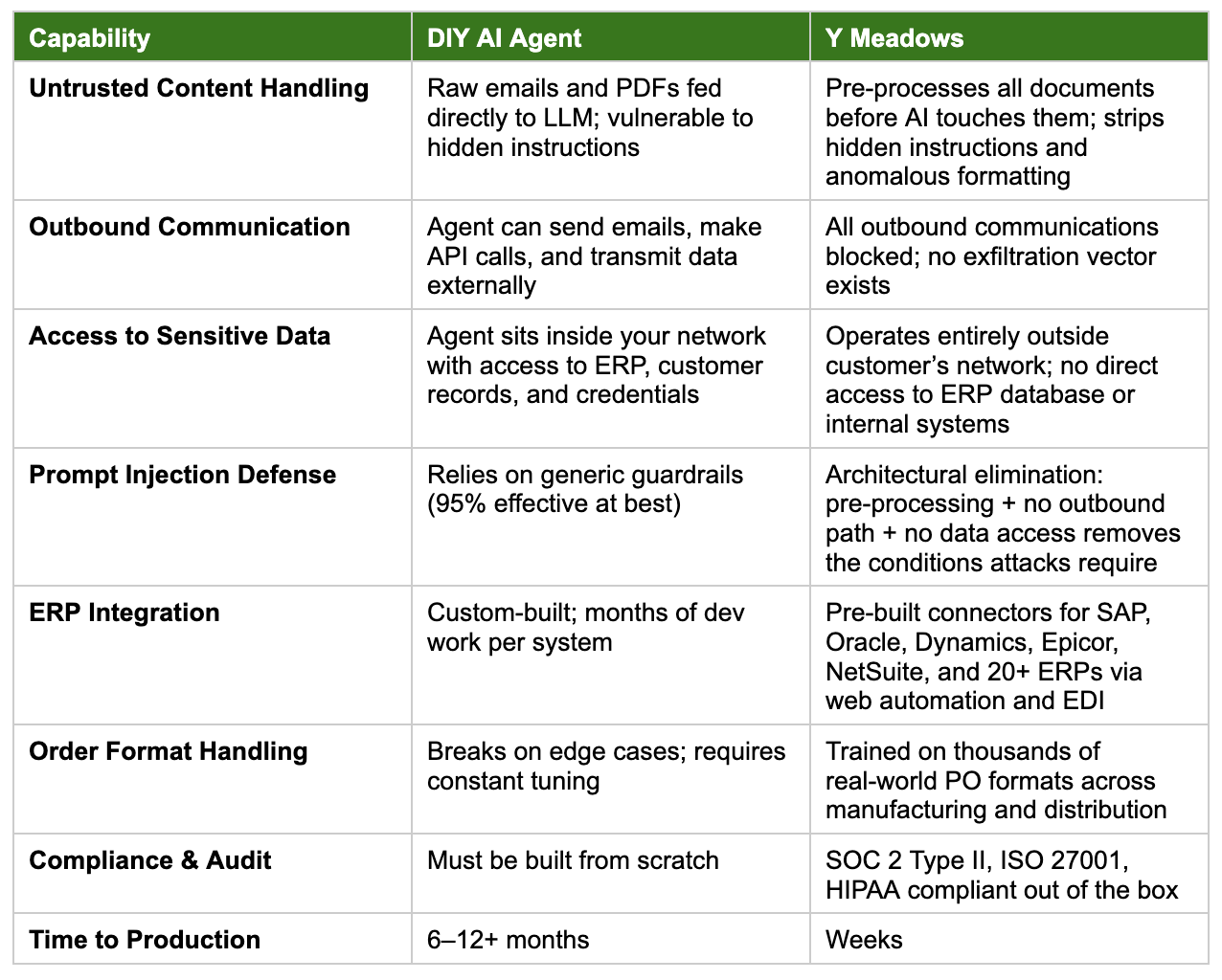 Leg 3 — Access to private data: Y Meadows operates entirely outside the customer’s network. The platform never has direct access to your ERP database, customer records, or internal systems. Orders are delivered into your ERP through validated connectors—including web automation and EDI pathways—but the AI itself cannot browse, query, or exfiltrate your sensitive data. There’s nothing to steal because the data isn’t there.